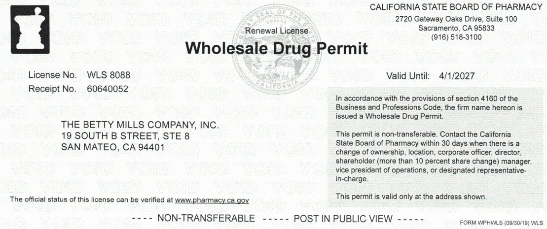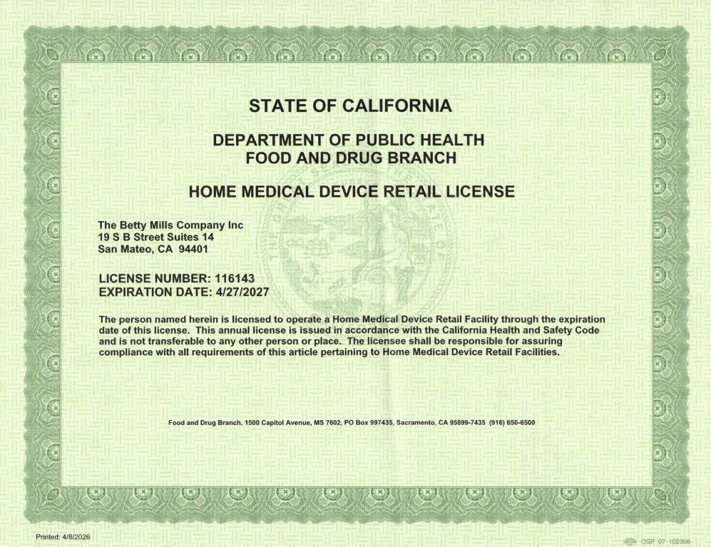 Betty Mills maintains both a Home Medical Device Retail (HMDR) license and Board of Pharmacy license in good standing with the Department of Public Health and the Board of Pharmacy. A snapshot of our current licenses is below.